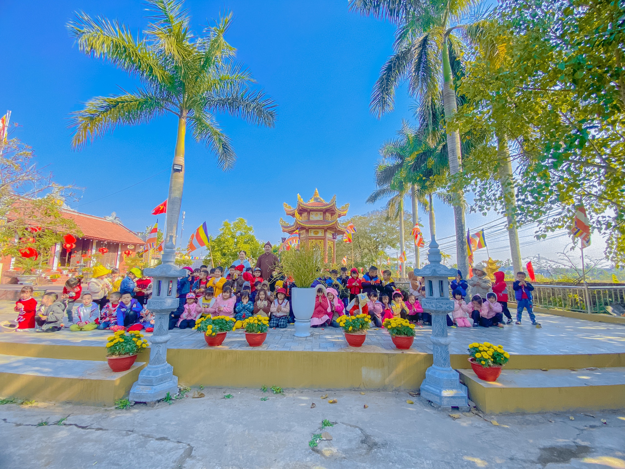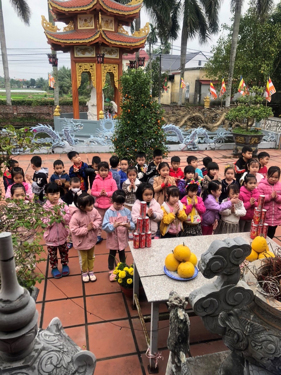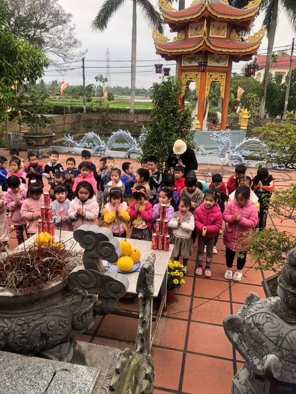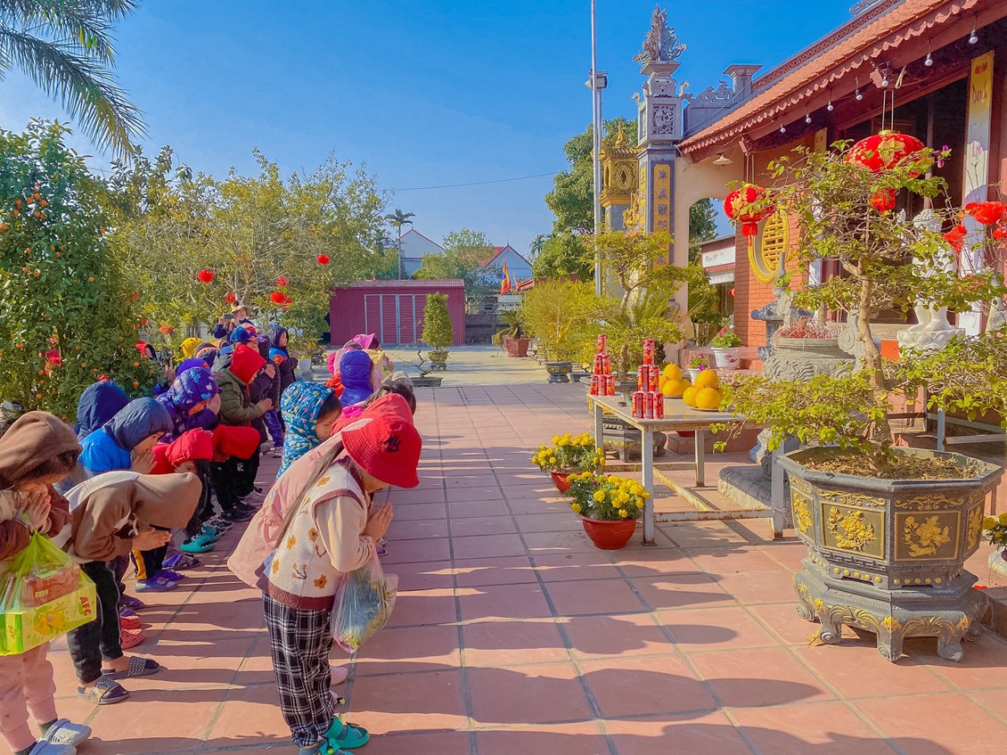 Đi chùa lễ phật là một thói quen của người Việt,đặc biệt là là dịp vào đầu năm mới, mọi người thường đi chùa cầu bình an,gia đạo may mắn hạnh phúc cho bản thân và gia đình.Cũng nhân dịp đầu năm mới cô và trò khối 5 tuổi trường mầm non Tự Cường cùng nhau đi lễ chùa cầu sức khỏe,bình an